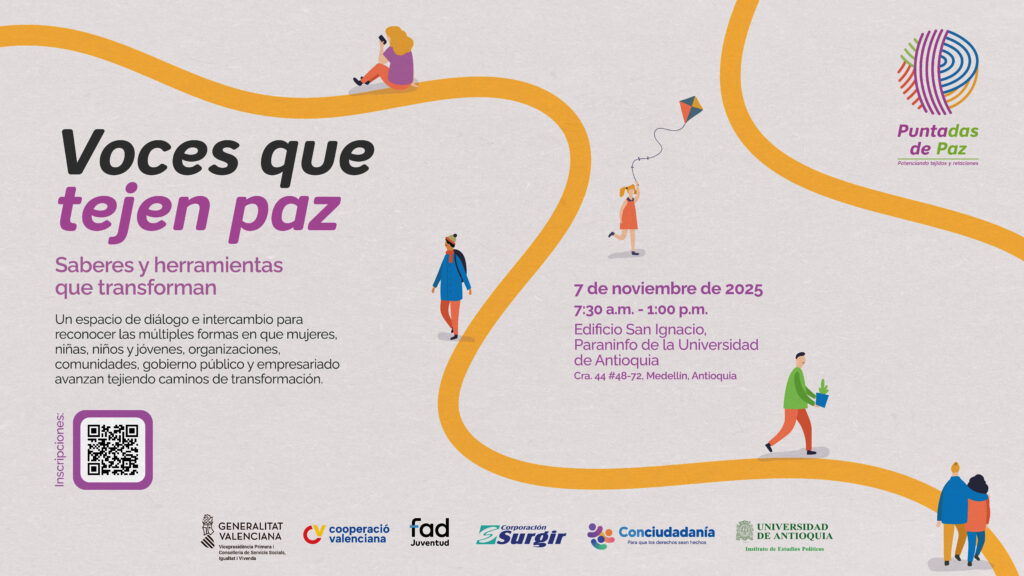 Voces que tejen paz es una iniciativa conjunta de la Corporación Surgir, la Corporación Conciudadanía y el Instituto de Estudios Políticos de la Universidad de Antioquia, en el marco del proyecto Puntadas de Paz II, que busca fortalecer capacidades y crear puentes entre actores diversos para avanzar hacia una paz total e integral con enfoque de género, derechos humanos e interculturalidad.